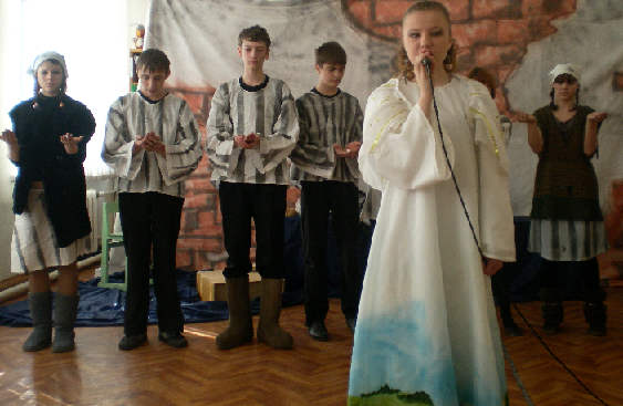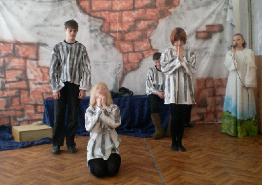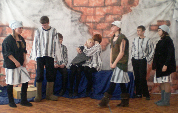Учащиеся 8 класса - Дейнеко Регина, Шайде Даша, Жирков Максим, Блаб Александр, Чащин Никита, Шмакова Лера, Леонова Юля, Асекина Наташа, Токарева Маша под руководством Шустовой Натальи Николаевны, руководителя театральной студии «Дебют», упорно трудились, репетировали каждый день. Для постановки была выбрана пьеса А. Н. Гуркова на военную тему «Апрель 45 года».